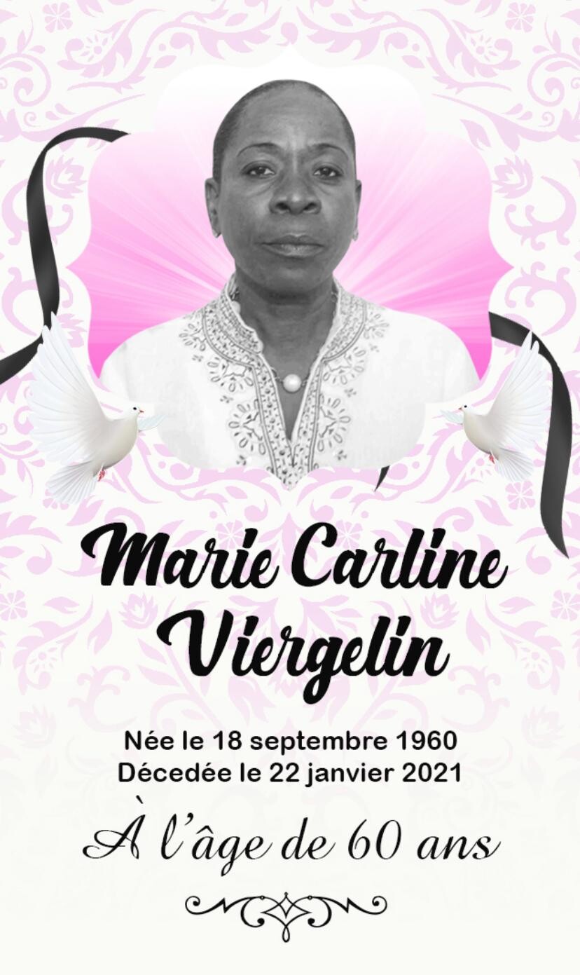 Les funérailles de madame Carline Viergelin seront chantées le samedi 30 janvier 2021 au Parloir de Pax Villa Maison Funéraire et Crematorium Sacré Cœur à 10h du matin où la dépouille sera exposée dès 8hAM.