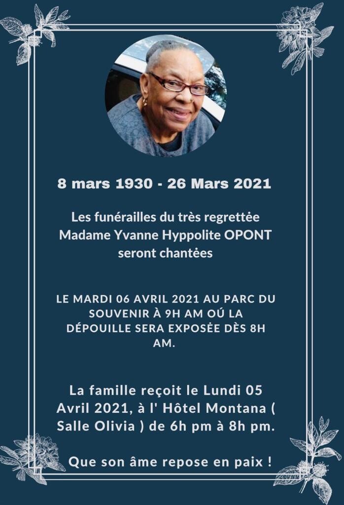 Les funérailles du très regrettée Madame Veuve Louis Aupont née Almoza Hyppolite seront chantées le mardi 06 avril 2021 au Parc du Souvenir à 9h du matin où la dépouille sera exposée dès 8h Am.