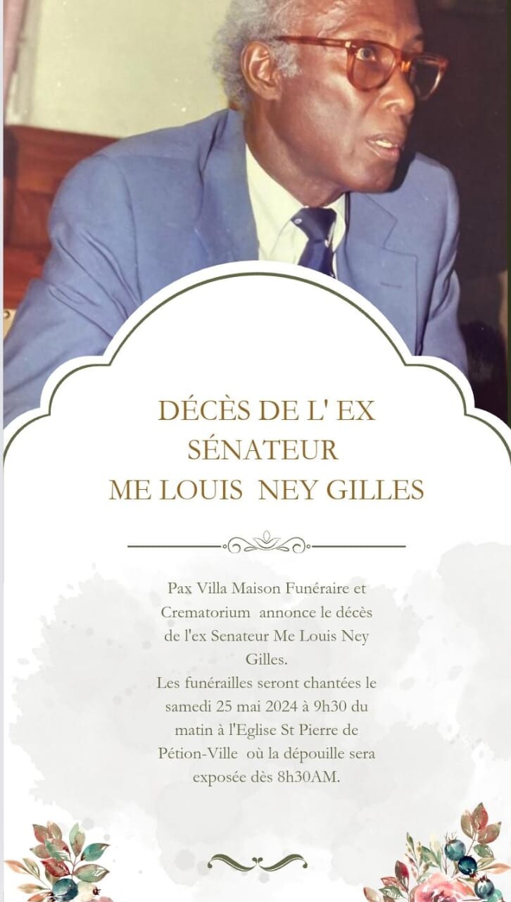 Les funérailles de M. Louis Ney GILLES seront chantées le samedi 25 mai 2024 à 9h30 du matin à l’Eglise St Pierre de Pétion Ville où la dépouille sera exposée dès 8h30AM.